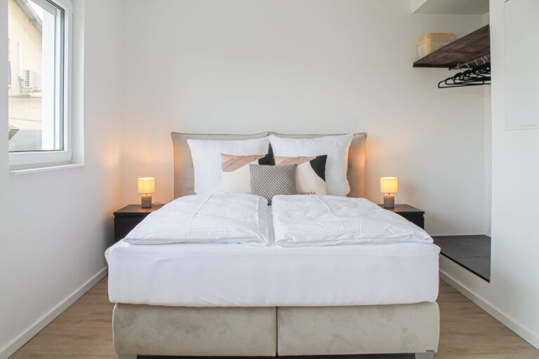 - frisch bezogenes Bett mit Kissen & Bettdecke